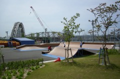 ASPOに入って最初にあるのがこのスケートリンク。スラローム用のパイロンやテーブルトップも設置されています。バスケットのリングなんかもある…。